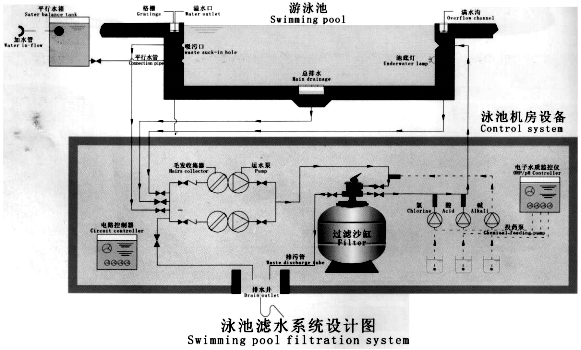 三、循環(huán)過濾式凈化:將使用臟了的游泳池水,按一定的流量連續(xù)不斷的送入過濾設備,除去池水中的污物,使水得到澄清,并投加消毒劑殺菌后,再送入游泳池使用。(循環(huán)過濾凈化系統(tǒng),可參照工藝流程說明)