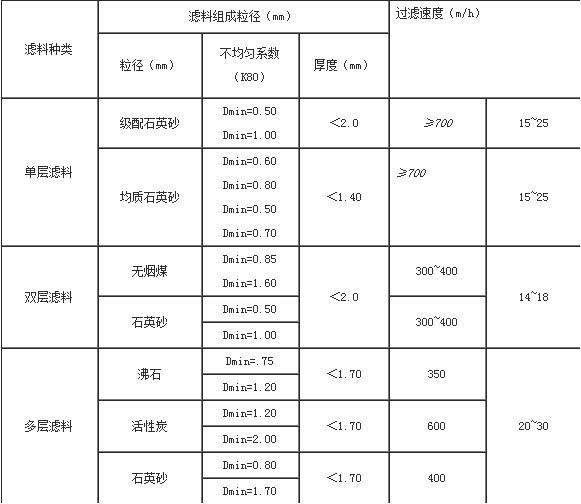 ●壓力過濾器的濾料組成、過濾速度和濾料層厚度,應經試驗后確定。當試驗有困難時,可按表5.4.3選用。