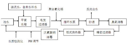本方案采用當今世界先進的水擬定工藝為典型的游泳池循環水處理工藝,其目的主要是去除水中懸浮雜質,消毒滅菌,滿足衛生要求。正常循環時,游泳池水通過回水管流入平衡水箱,在平衡水箱后循環泵吸水管上加入絮凝劑,以便通過水泵時能充分與水混合;池水經過毛發過濾器截留較大顆粒固體雜質、毛發、纖維等,以保護水泵和砂缸過濾層不被破壞;出水經循環水泵進入高速過濾砂缸進行微絮凝過濾;然后經過臭氧消毒,再通過精密過濾器進一步過濾去除水中5微米以上的雜質,經過換熱器,使水溫達到相應要求。此時加入消毒劑,以殺滅水中細菌,保持一定的余氯量,再經過PH檢測調整后循環至游泳池。
